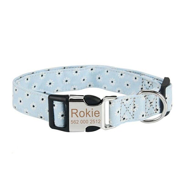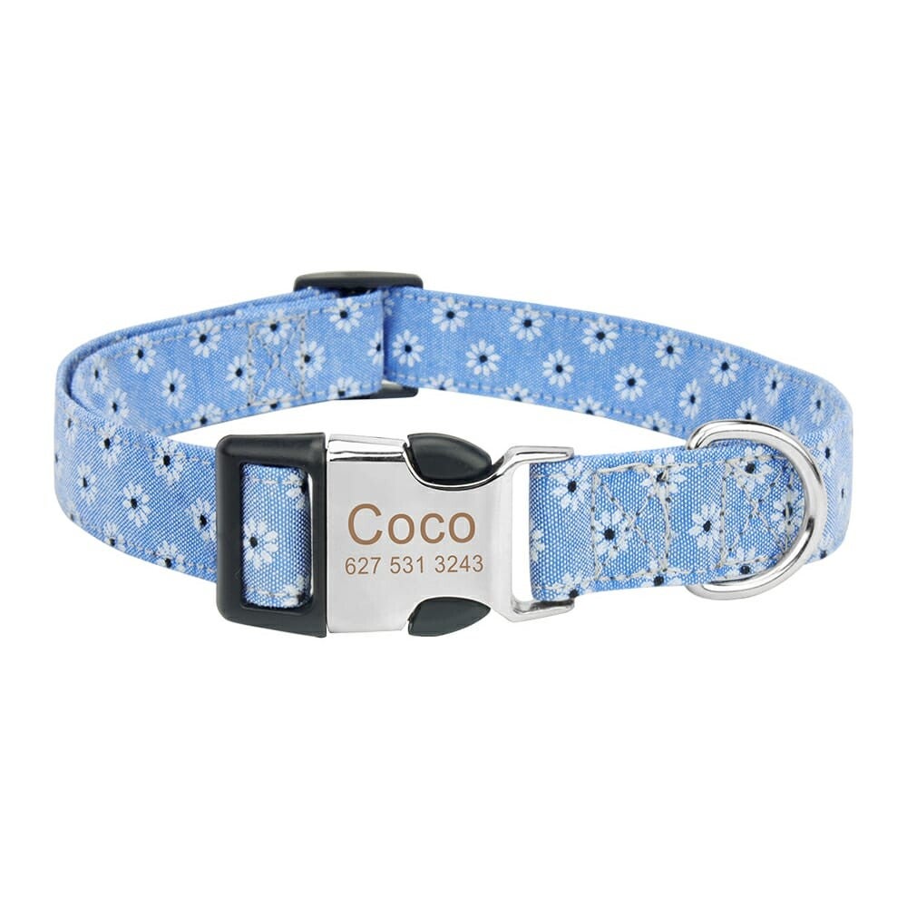 Collar para mascota realizado en tela de la mejor calidad con hebillada en acero inoxidable personalizada con el nombre de tu mascota y tu número de telefono.